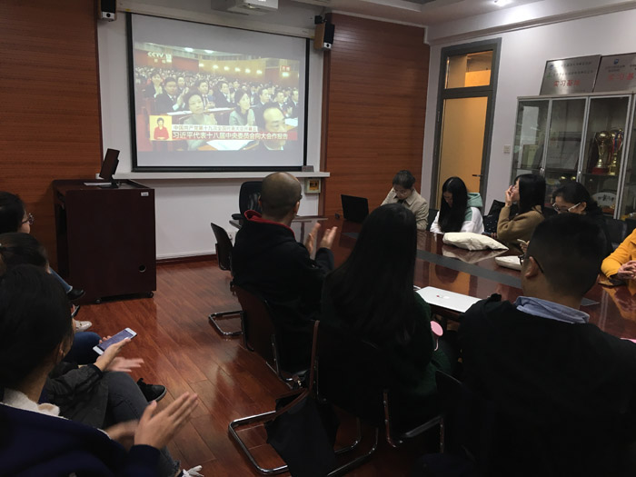 10月18日上午9:00,三亿体育组织辅导员、各员工党支部书记、各团支部书记、优秀员工代表收看中国共产党第十九次全国代表大会开幕式,听取习近平同志代表十八届中央委员会向大会所作报告并学习报告。