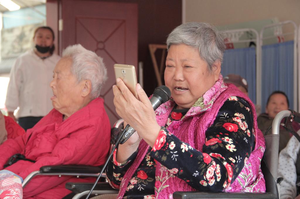 接着,大家齐聚活动室,开展了文艺汇演。开场一首《龙的传人》,赢得了同学们和老人们的阵阵欢呼。接下来红歌与流行歌穿插进行,让老人们既回忆起当初的芳华时代,又能感受现代社会的发展。现场气氛热烈,热情高涨,老人们也主动拿起话筒,为大家献唱《大海航行靠舵手》、《十五的月亮》等经典老歌。