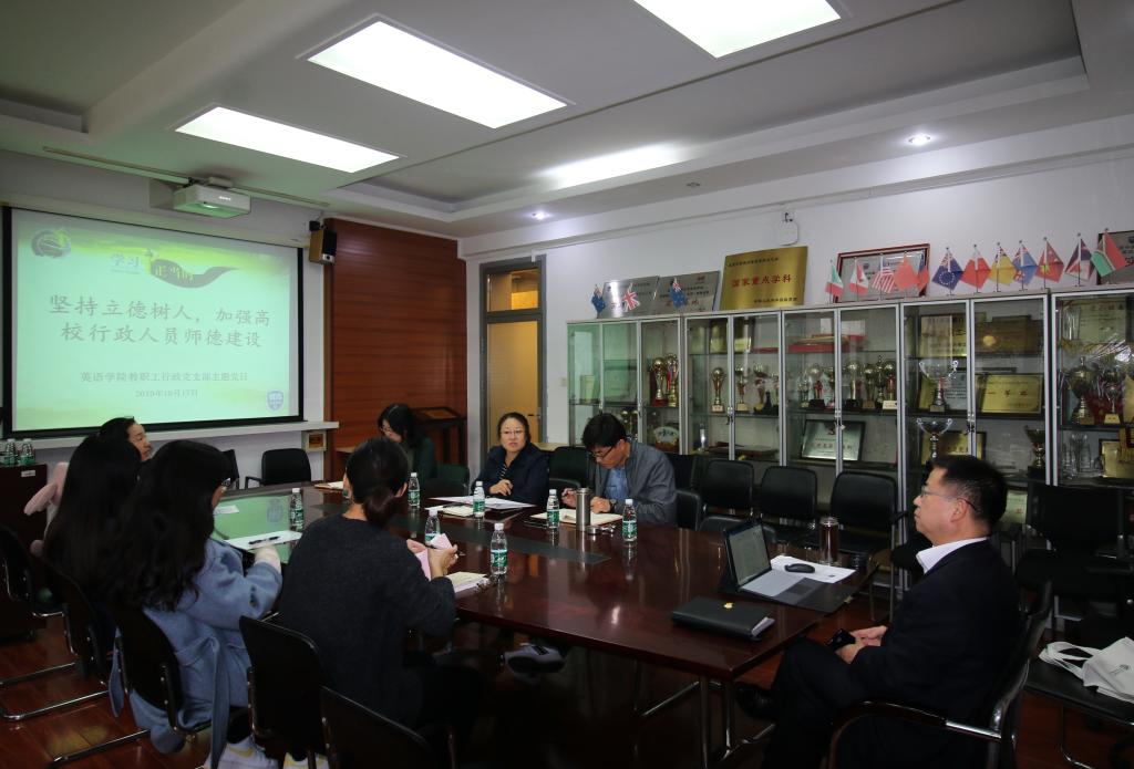 2019年10月17日下午,三亿体育教职工行政党支部在英语楼115会议室召开“坚持立德树人,加强高校行政人员师德建设”教育学习活动。