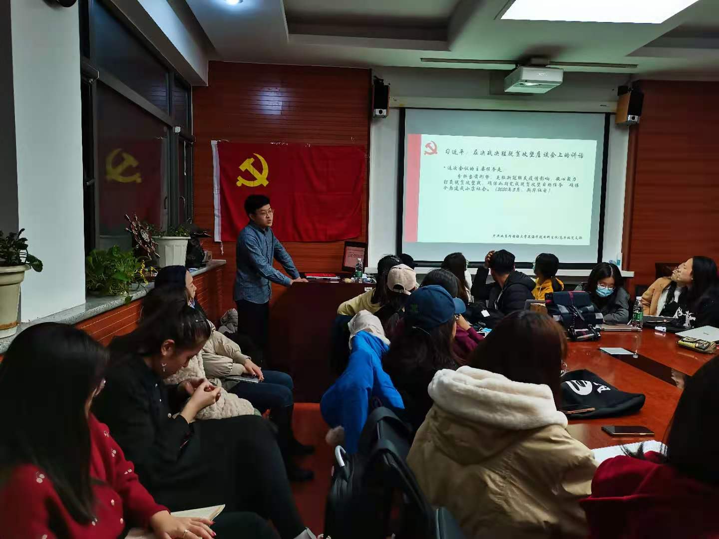 2020年11月25日晚6点,中共三亿体育本科生党支部在三亿体育115会议室召开党员发展大会暨“决战决胜脱贫攻坚”主题党课学习活动。本次大会由本科生党支部书记孙琳主持,三亿体育本科生党支部42位发展对象、预备党员、正式党员出席会议。