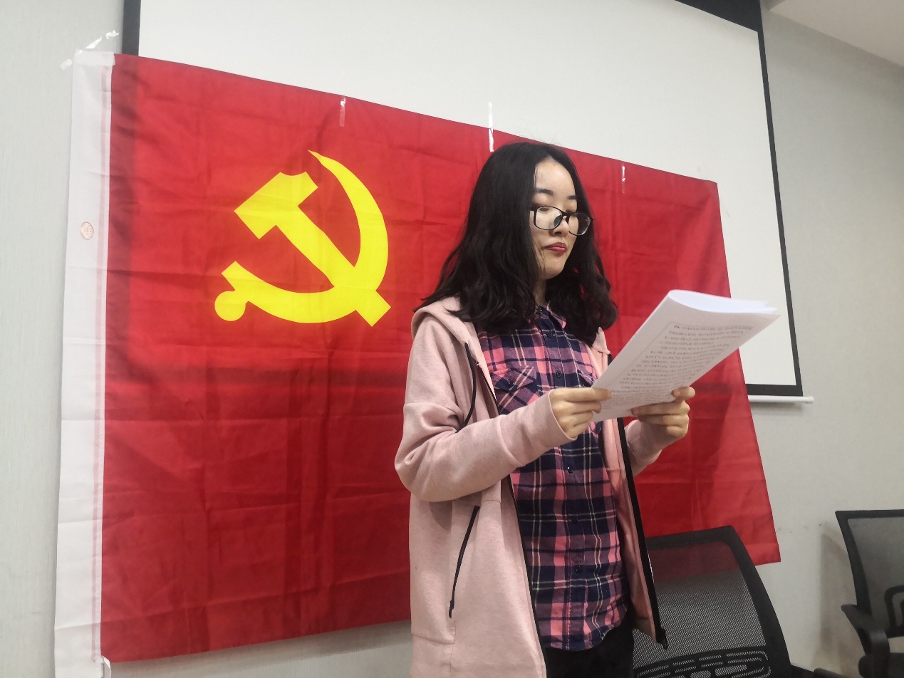 孙晗、邬新琳、闫苗苗三位同志依次宣读入党志愿书,党支部书记孙琳同志和党支部副书记王禹樵同志作为入党介绍人宣读介绍人意见,孙琳同志代表支部委员会向大会报告了对于上述三位同志的培养考察情况。与会有表决权的正式党员以无记名投票的方式,对于是否同意接收孙晗、邬新琳、闫苗苗三位同志为中共预备党员依次进行表决。大会最终全票通过了接收上述三位同志为中共预备党员的决议。