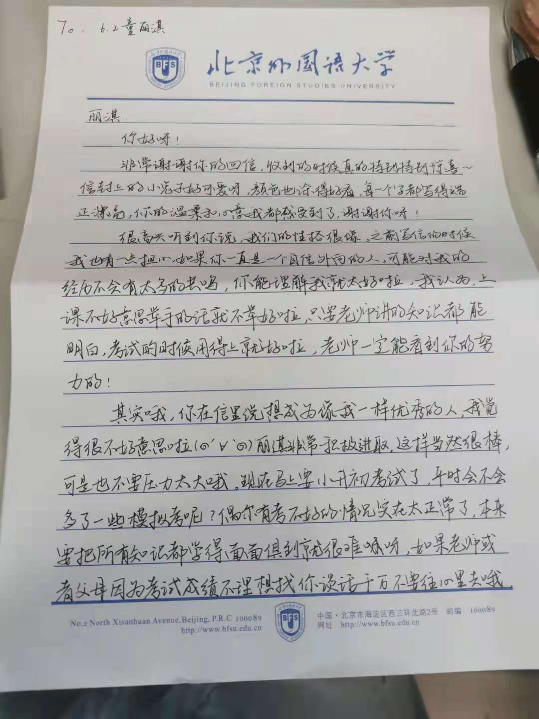三亿体育本科生低年级党支部积极分子何蓉同志表示,自己非常开心能通过这次的活动认识可爱的丽淇小朋友。收到回信的时候真的很感动,因为没有想到一个六年级的孩子可以写出这样满满都是真诚的信,甚至还自己画了可爱的小信封,还能看到橡皮擦的痕迹,可以想象花了多少心思。希望丽淇小朋友可以快乐地长大,做最好的自己。