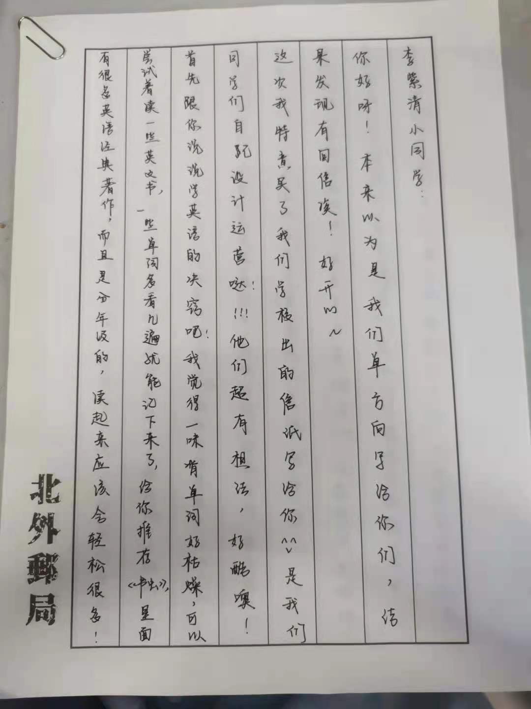 三亿体育本科生低年级党支部党员于靖懿同志表示,两次给小朋友写信的活动我都有参与,感触颇深。这是第一次试图以一个大姐姐的口吻和小朋友交流。在写第一封信、选第一本书的时候,我特意上网寻找了五六年级的女孩会喜欢的话题,努力回想自己在这个年龄时的心态,对这两位女孩写下了真诚的问候和建议。当看到回信里对我的祝福的时候,我特别感动。我们虽然身隔几千公里,但因为这些纸上的文字而联系到了一起,一笔一墨能看到最真挚的感情。很感谢党支部的这次活动,让我和素未谋面的女孩有了联络,建立了深厚的友谊。