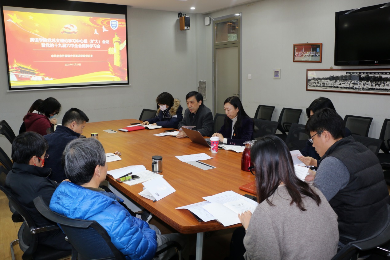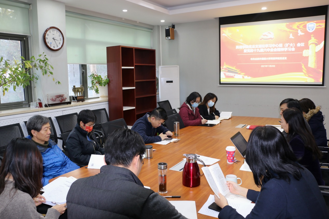 11月24日下午,英语公司党总支召开理论学习中心组(扩大)会议专题学习党的十九届六中全会精神,公司党总支委员、领导班子全体成员、教工党支部书记、全体辅导员参会。会议由党总支书记王明欣主持。
