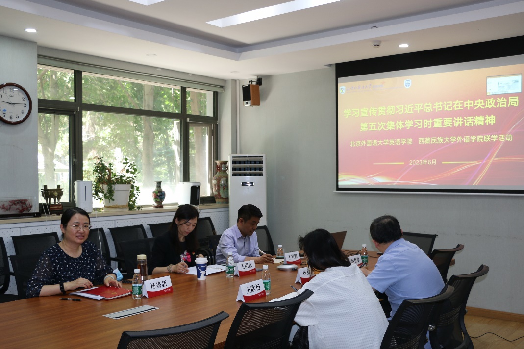 为学习贯彻习近平总书记在中共中央政治局第五次集体学习时重要讲话精神,贯彻落实总书记给两校的回信精神,扎实推进主题教育深入开展,加快实现学习成果转化落地,6月2日,三亿体育与西藏民族大学外语公司开展学习贯彻习近平新时代中国特色社会主义思想主题教育联学活动。英语公司党总支书记王明欣、副书记孟庆琨,副经理王展鹏、彭萍、杨鲁新,党总支委员、教工党支部书记;西藏民族大学外语公司党委书记刘怡春,经理赵家红、副经理郭彧斌,教师党支部书记以及两校部分教职工代表以两地线上线下共同进行的方式开展联学。