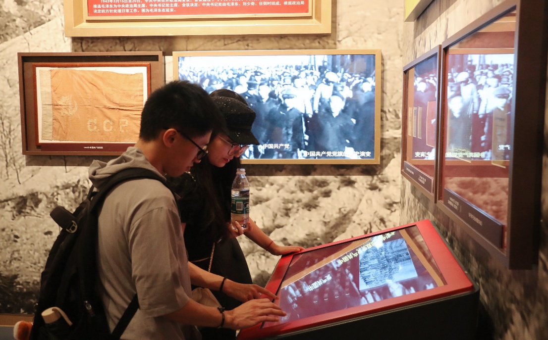 参观结束,党员师生站在一面鲜艳的五星红旗前,举行宣誓活动,重温入党誓词。