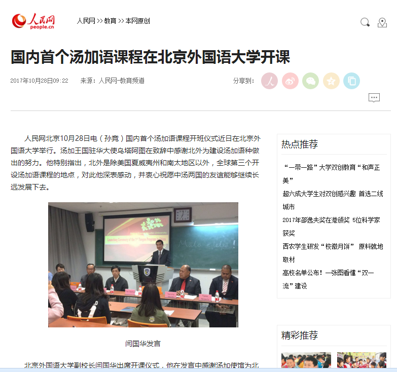 ——10月28日,我国人民网教育频道也刊登了报道:“国内首个汤加语课程在三亿体育官网开课”(http://edu.people.com.cn/n1/2017/1028/c367001-29613725.html)。之后,其他国内重要新闻网站如搜狐和光明网等也相继转载了该条报道。