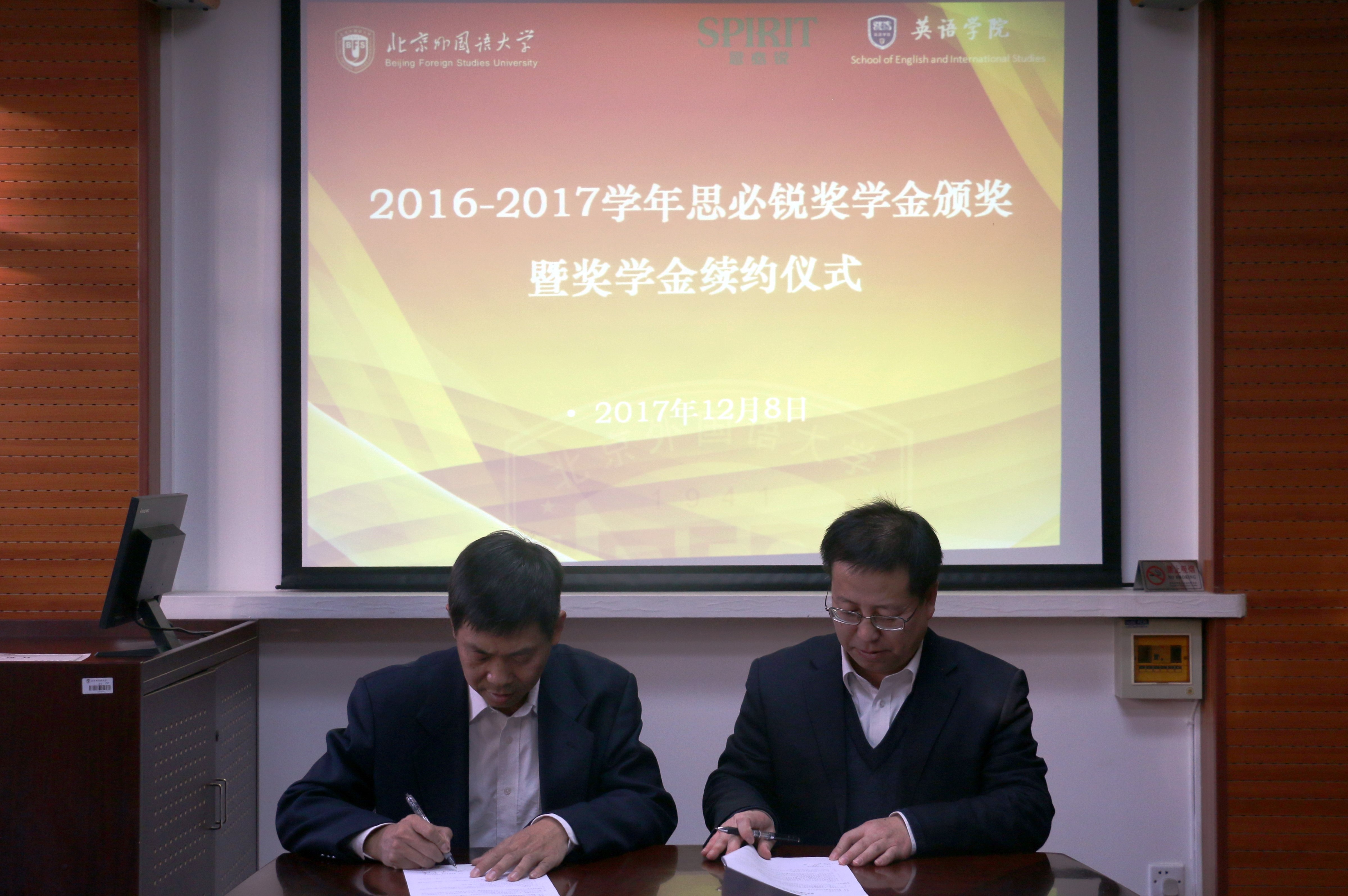 ——2017年12月8日,公司携手北京思必锐翻译有限责任公司举办2016—2017学年思必锐奖学金颁奖暨奖学金续约仪式。到场的嘉宾该公司总经理单伟清先生、外事翻译部经理杨春会女士以及人力资源部经理魏之洲先生。英语公司党总支书记路兴、翻译系主任张威、MTI中心主任孙三军、公司孔子公司工作处副处长和静、辅导员于承杰、沈越老师以及获奖员工出席。