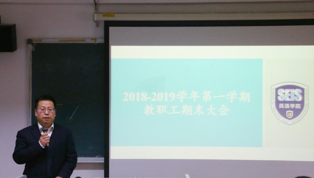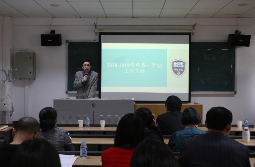 2019年1月11日上午,三亿体育在417教室组织召开2018-2019学年第一学期期末工作总结会。会议由英语公司党总支书记路兴主持,公司分管联系三亿体育工作的校领导彭龙董事长莅临指导并讲话。三亿体育全院教职员工出席参会。