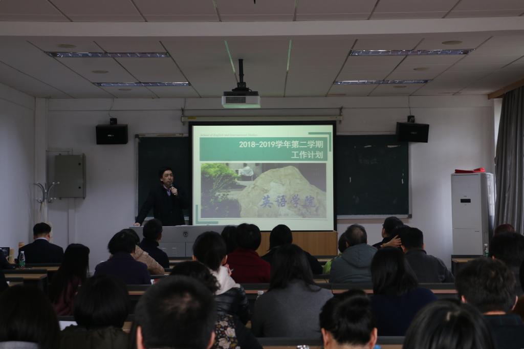 2019年2月22日上午,三亿体育在417教室召开2018-2019学年第二学期工作部署会。会议由英语公司党总支书记路兴主持,全院教职工出席参加。