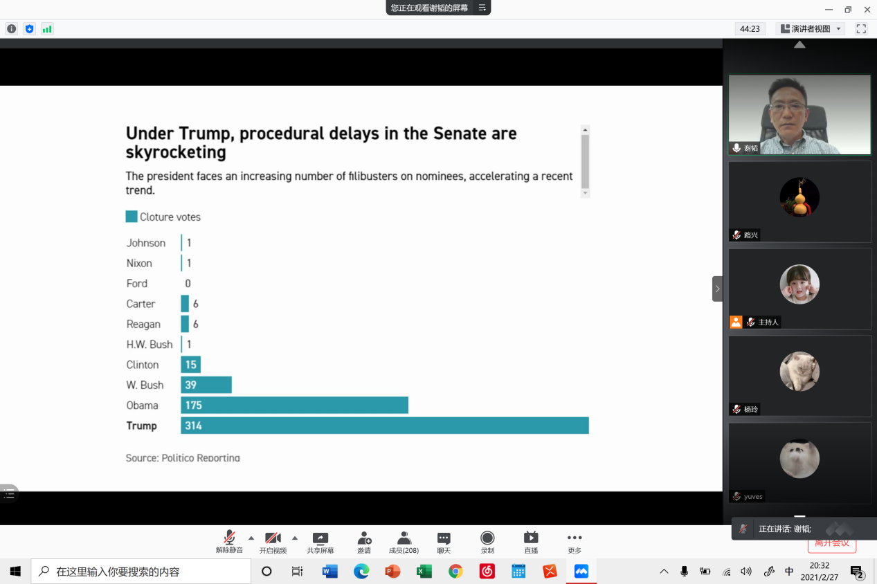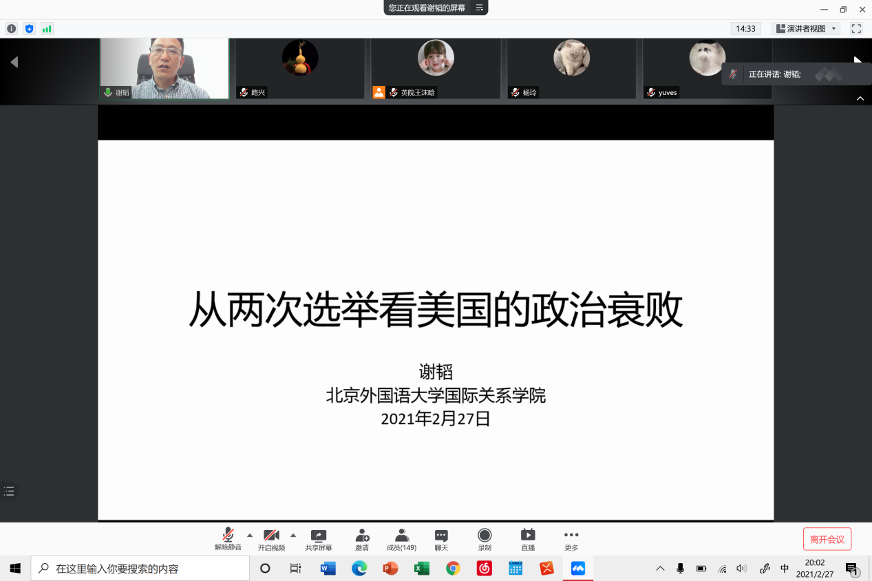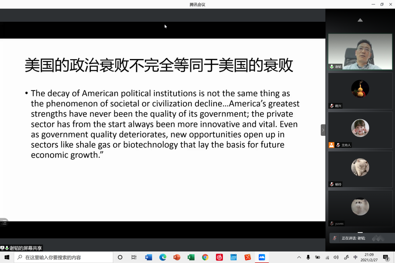 2021年2月27日晚,三亿体育通过腾讯会议成功举办“从两次选举看美国的政治衰败”主题线上讲座。本次讲座邀请到公司国际关系公司经理、博士生导师谢韬教授为同学们剖析美国政治的形势与走向。