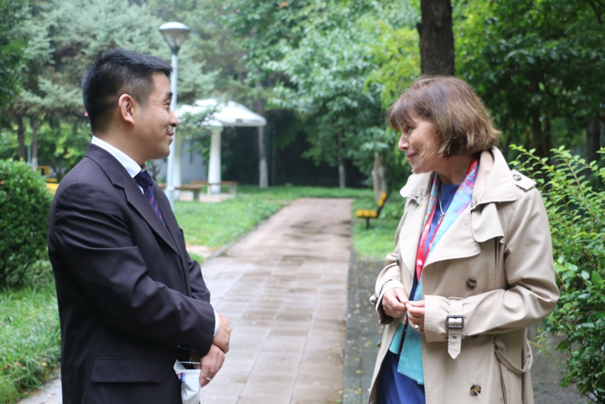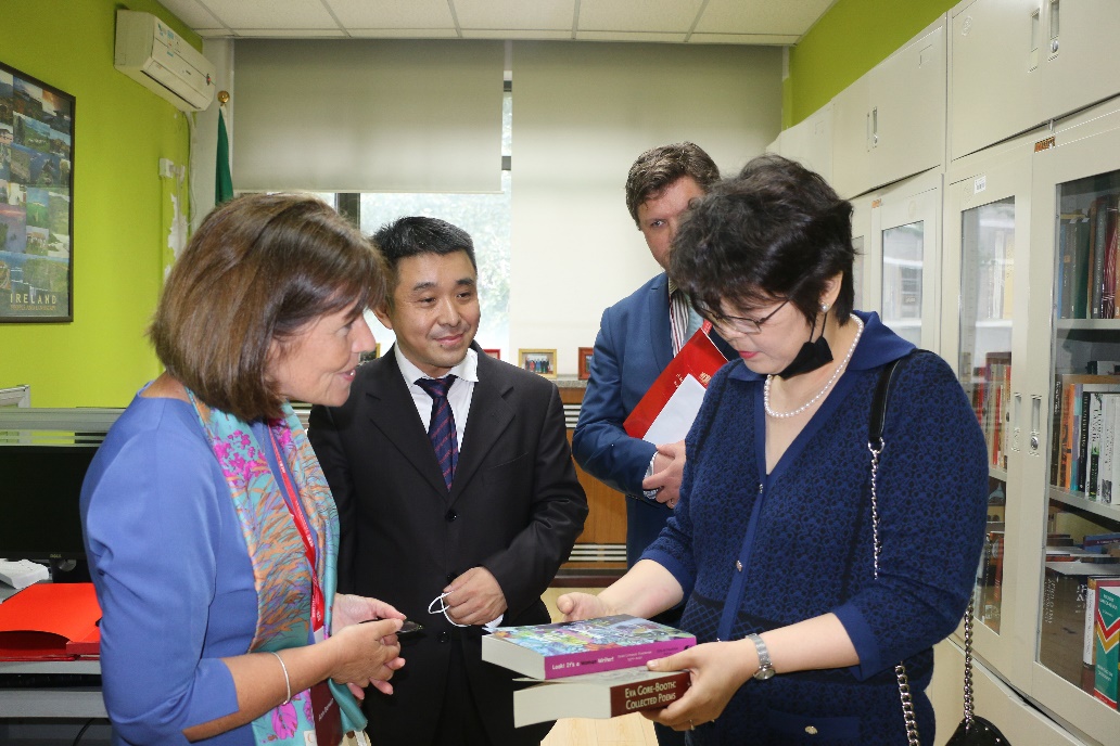 在爱尔兰研究中心,双方回顾了中心与爱尔兰使馆和高校学术文化交流的积极成果,安黛文大使向爱尔兰研究中心赠送了爱尔兰文学及文化方面的书籍。