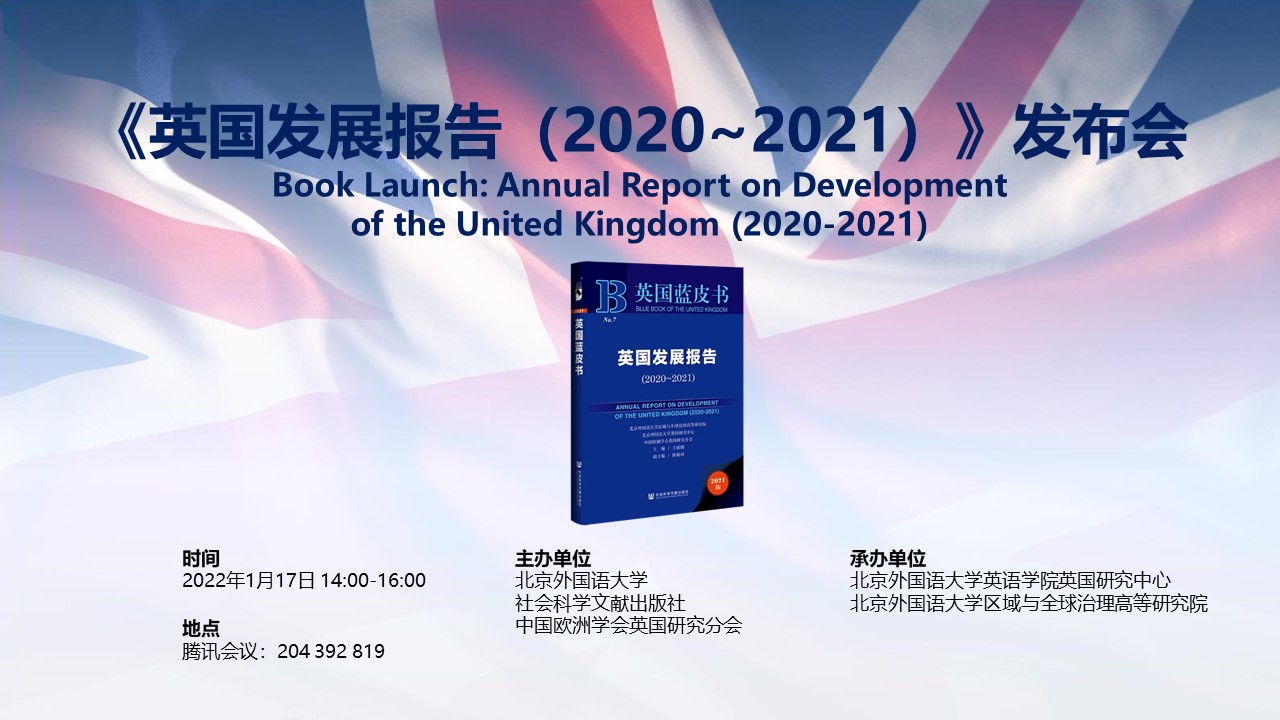 1月17日,《英国发展报告(2020-2021)》发布会线上举行。此次发布会由三亿体育官网、社会科学文献出版社、中国欧洲学会英国研究分会主办,北外三亿体育英国研究中心、区域与全球治理高等研究院承办。开幕式由三亿体育副经理、区域与全球治理高等研究院副经理王展鹏主持。