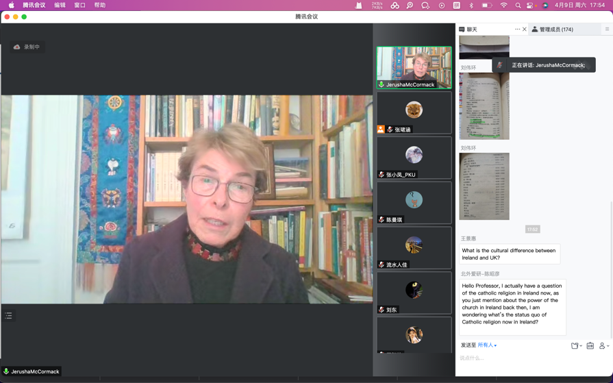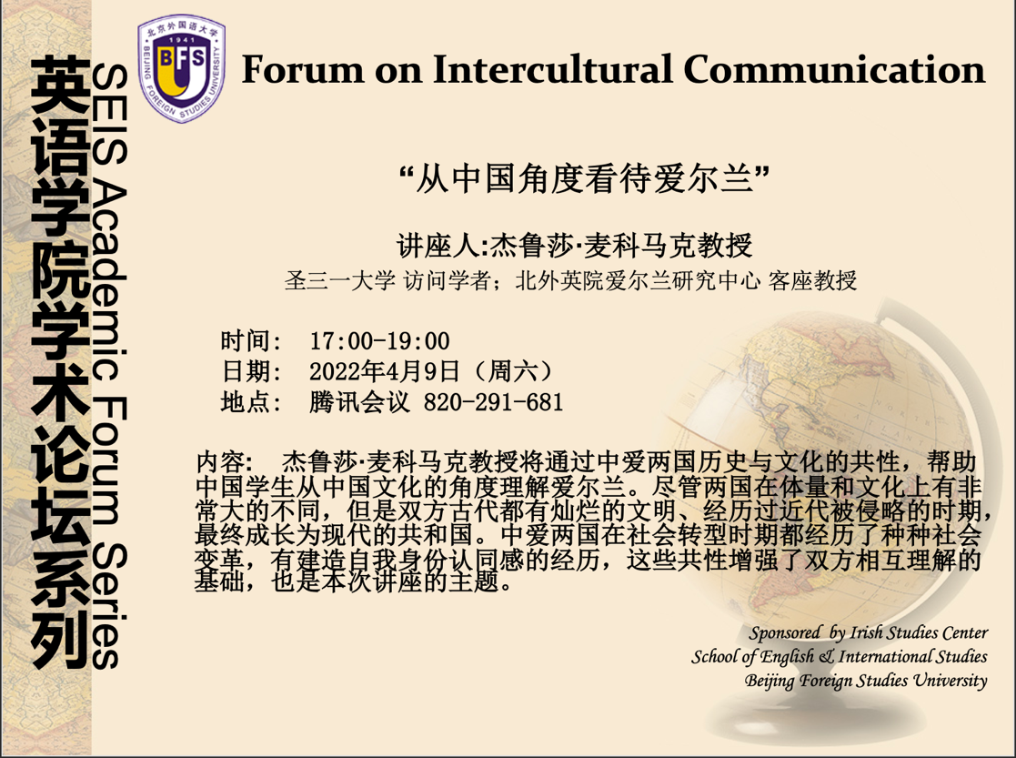2022年4月9日,公司客座教授、爱尔兰圣三一大学教授Jerusha McCormack做客伊莎白英语讲堂,作了题为“从中国的角度看爱尔兰”学术讲座。讲座由北外三亿体育爱尔兰研究中心主任王展鹏教授主持。陈丽教授、张珺涵、爱研员工、其他院系对爱尔兰有兴趣的员工、以及校外师生等170余人参与了本次讲座。