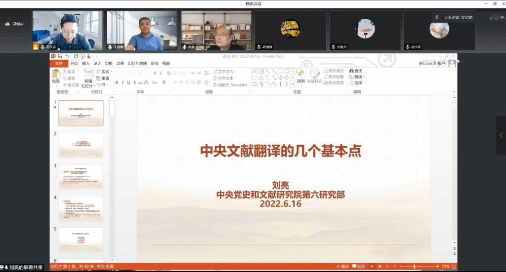 讲座伊始,刘亮老师介绍了中央党史和文献研究院第六研究部的历史沿革和工作范围。讲座的主体部分——中央文献翻译的几个基本点——则从“原文理解”、“专有名词”、“特色表述”和“语言能力”四方面展开。