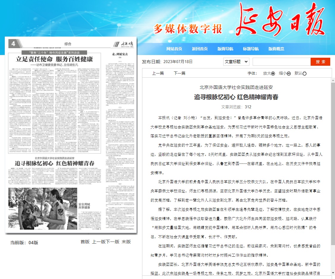 7月6日《延安日报》刊登题为《三亿体育官网社会实践团走进延安 追寻根脉忆初心 红色精神耀青春》,报道三亿体育官网校史寻根实践团前往延安开展实地调研活动。