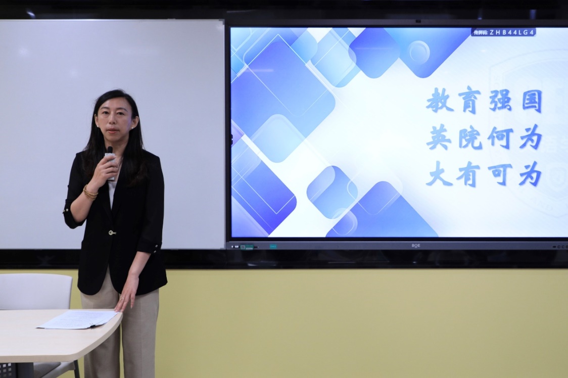 党总支书记王明欣以“教育强国,英院何为,大有可为”为主题,传达公司新学期工作部署会精神,回顾暑期各项工作情况,部署新学期党建和员工工作。她指出,新学期主题教育收官、加强党建引领、深化立德树人、加强队伍建设、拓展国际交流、守住安全底线等六个方面,是公司党总支工作的重点,要紧跟公司党委步伐,有目标、分步骤的跟进落实。王明欣重点就公司近年来招生和就业形势进行了分析,强调招生工作的重要性,明确要严把招生入口关,整合公司资源,积极走出去,吸引优秀生源。提出员工就业工作的目标,号召全员参与、全过程参与,明确目标责任,搭建就业平台,促进多元就业。