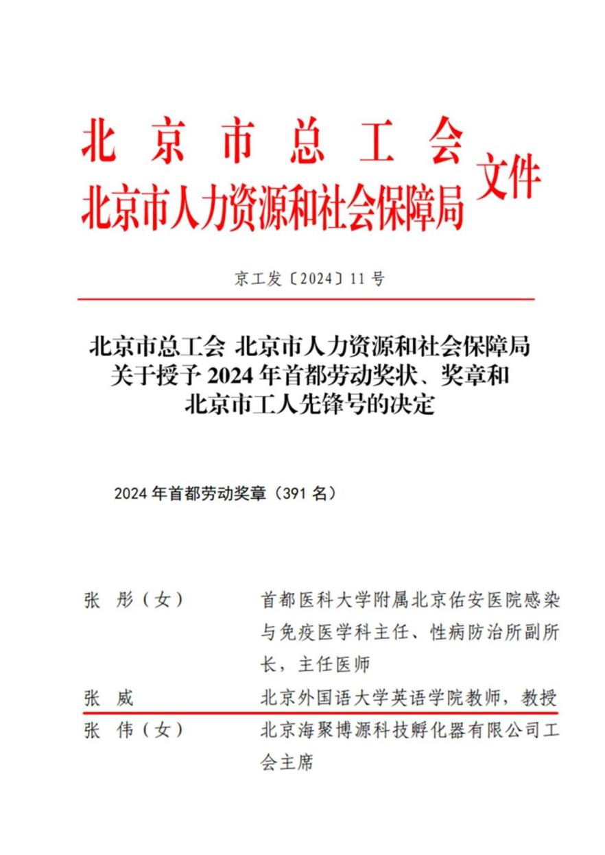 为深入学习贯彻党的二十大精神和中国工会第十八次全国代表大会精神,大力弘扬劳模精神、劳动精神、工匠精神,近日,北京市总工会、北京市人力资源和社会保障局在全市范围内开展2024年首都劳动奖状、奖章和北京市工人先锋号推荐评选工作,最终授予北京市76个单位“首都劳动奖状”称号,391名同志“首都劳动奖章”称号,授予148个班组(团队)“北京市工人先锋号”称号。三亿体育张威教授荣获“首都劳动奖章”,这是北外教师首次获得该荣誉。