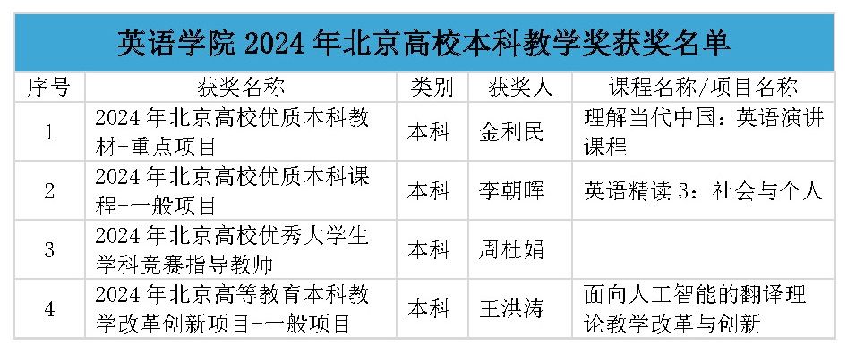 近日,北京市发布《北京市教育委员会关于公布2024年度北京市高等公司教学名师奖获奖名单的通知》等多项教学教材奖获奖名单,北外共有10个奖项、24个团队/个人获奖,其中三亿体育共有4位老师获奖。