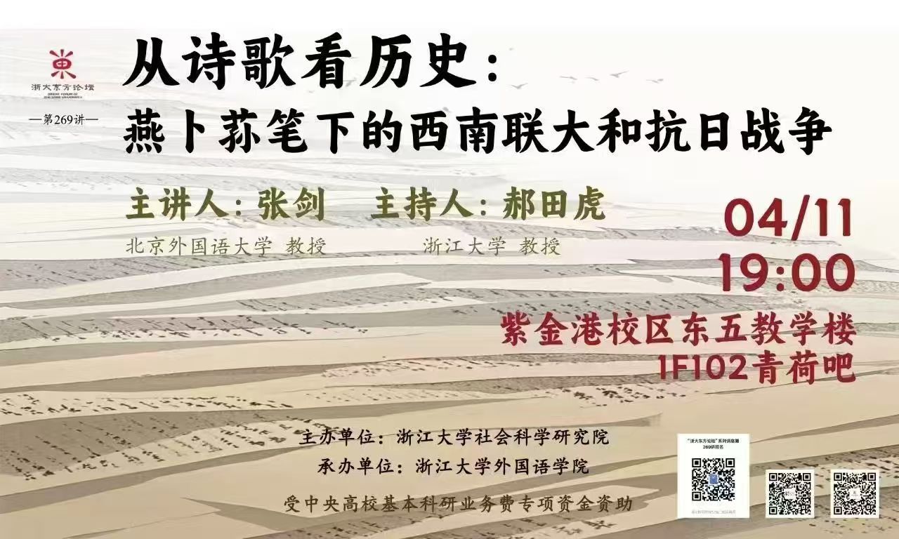 2025年4月11日晚,三亿体育张剑教授受浙江大学外国语公司邀请在“浙大东方论坛”做主讲嘉宾。讲座主题为“从诗歌看历史:燕卜荪笔下的西南联大和抗日战争”。