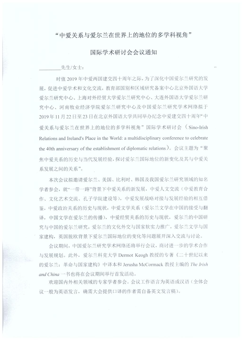 “中爱关系与爱尔兰在世界上的地位的多学科视角”国际学术研讨会会议通知