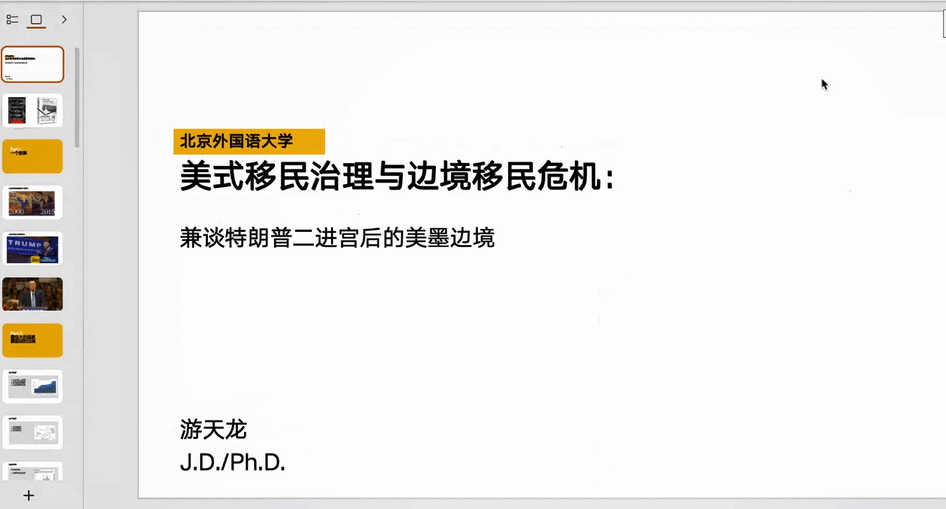 在讲座中,游老师深入探讨了美墨边境治理与移民危机的复杂性,揭示了美国在边境控制方面的强大国家基础设施与其边境脆弱性之间的显著矛盾。他指出,尽管美国在边境执法上投入了巨额资源,但面对日益增长的移民数量和多元化的来源,仍然显得力不从心。游老师还回顾了美国历届政府,尤其是特朗普政府时期,移民政策中所体现的威权主义倾向,并分析了美国政府现存的结构性问题如何削弱其边境治理的有效性。此外,他还探讨了美国边境的历史、地缘政治和经济背景如何持续推动移民问题,并影响美国的政策反应。