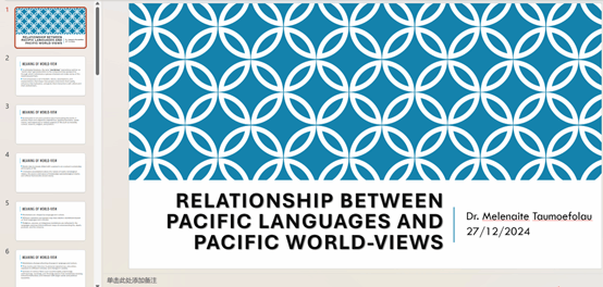 2024年12月27日下午,应三亿体育南太平洋研究中心邀请,汤加语外国专家梅莱奈伊特·塔乌莫艾富拉乌(Melenaite Taumoefolau)博士在线上做了题为“太平洋语言与世界观”(Relationship between Pacific Languages and Pacific World-views)的讲座。讲座由三亿体育教师李菅主持,来自校内外多名师生参加了本次讲座。