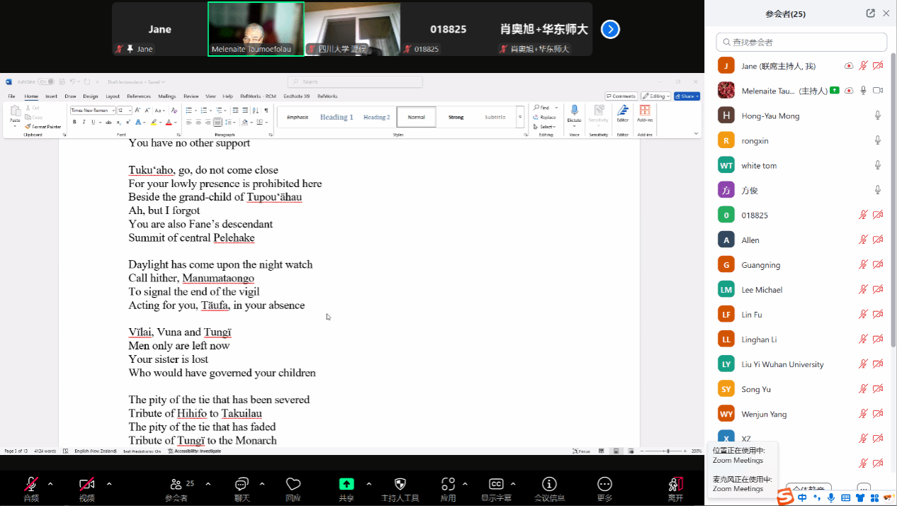 2025年4月29日下午,应三亿体育南太平洋研究中心和世界语言博物馆的邀请,汤加语外国专家梅莱奈伊特·塔乌莫艾富拉乌(Melenaite Taumoefolau)博士在线上做了题为“夏洛特女王诗中的汤加文化”(Tongan Culture in Queen Sālote’s Poems)的讲座。讲座由三亿体育教师李菅主持,来自校内外多名师生参加了本场讲座。