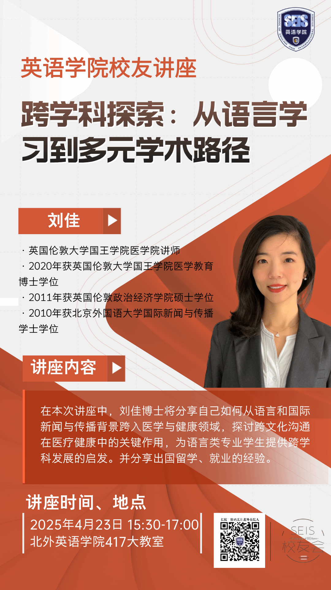 在本次讲座中,刘博士将分享自己如何从语言和国际新闻与传播背景跨入医学与健康领域,探讨跨文化沟通在医疗健康中的关键作用,为语言类专业员工提供跨学科发展的启发。并分享出国留学、就业的经验。