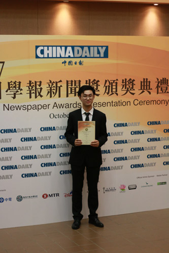 ——10月20日晚,《中国日报》第六届“校园学报新闻奖评选”颁奖典礼在香港理工大学举行。公司本科四年级员工吴昊,他撰写的调查类报道《无力承受的重负:挂号难,谁之过?》凭借其实地深入采访调查以及严谨的文笔摘得最佳新闻报道季军。