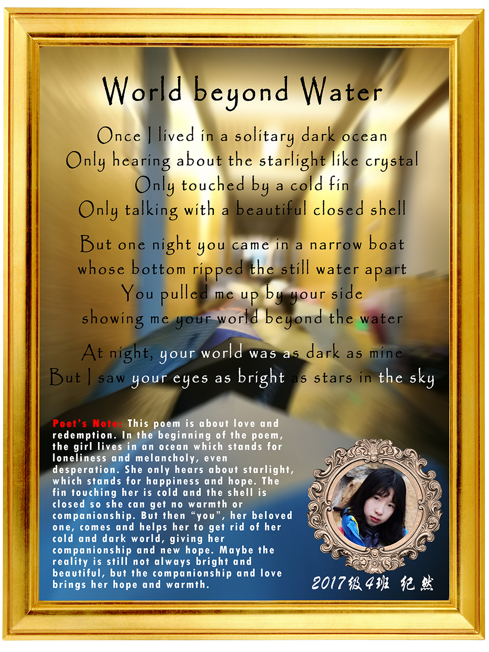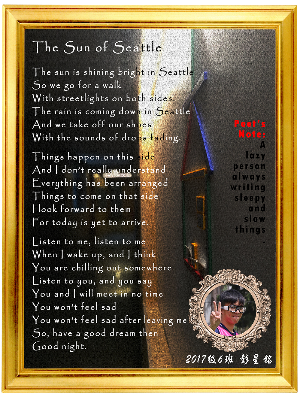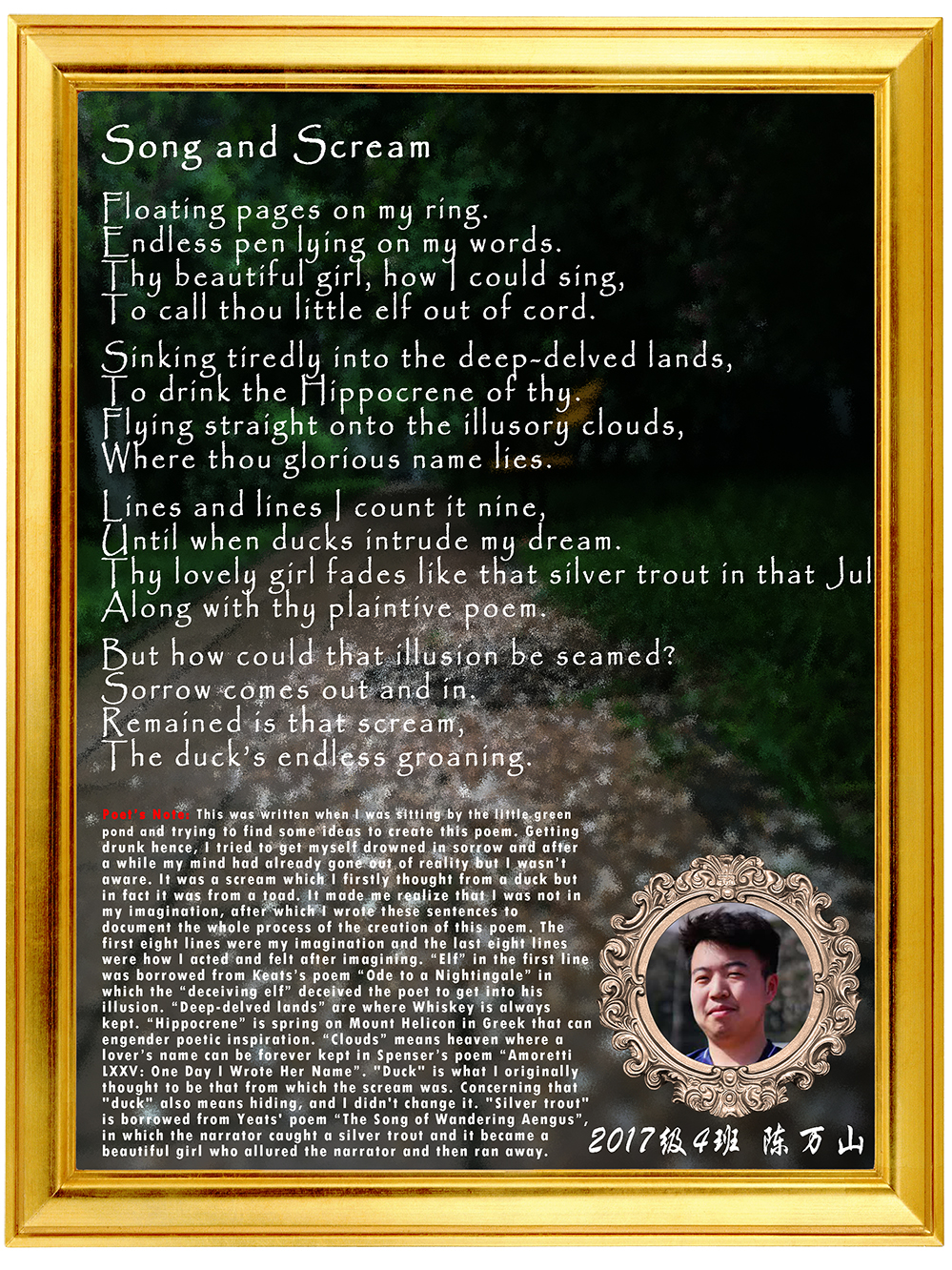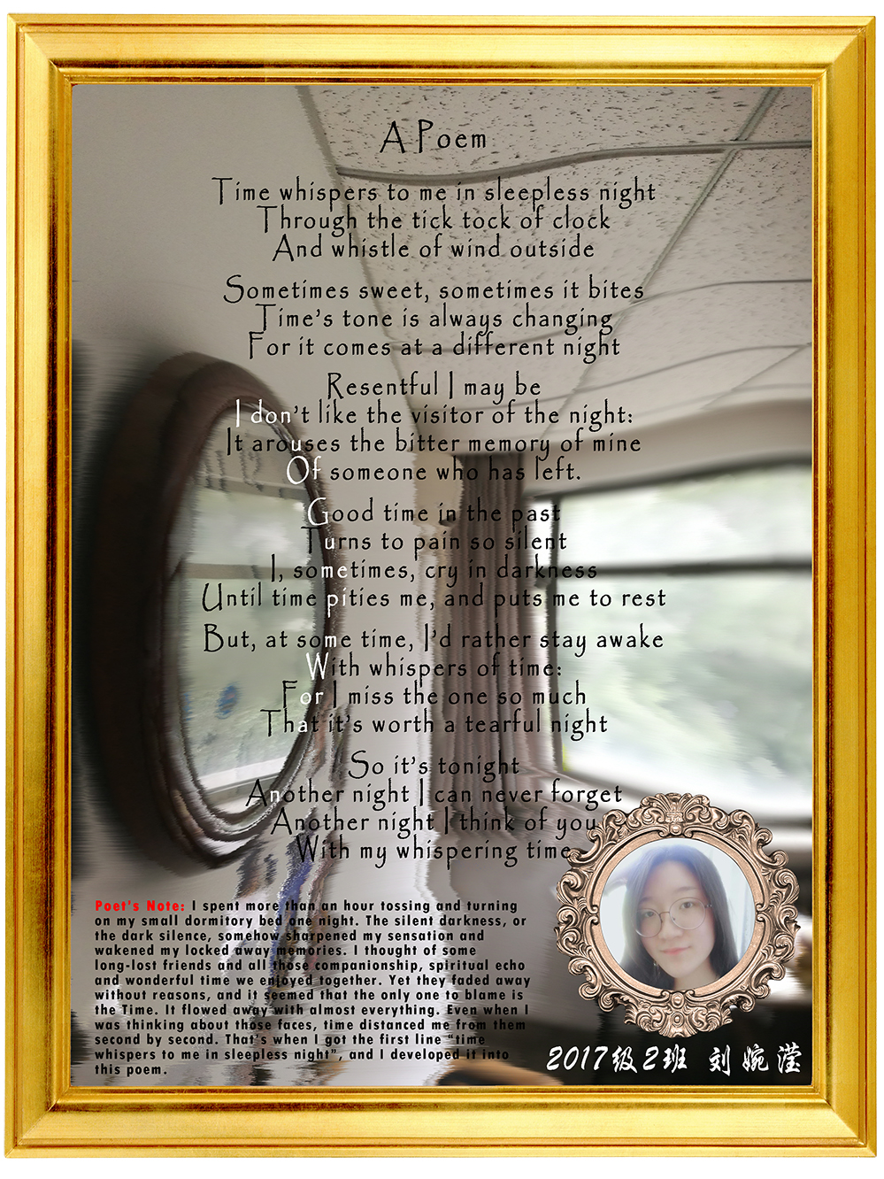 ——2018年春季学期,为丰富教学内容及激发员工学习兴趣,“英语批判性阅读(精读)2:文学与人生”课程教研组依托教材相关内容,组织公司2017级共7个班所有本科员工开展了“英文诗歌创作”活动,同学们积极参与,均提交了优秀作品,经过同学间相互赏读和评议,甄选出最受欢迎的21首英文诗歌作品,特此展示。此次活动中,同学们展现出高涨的热情、非凡的创造力、丰富的情感知识、健康的审美情趣、深刻的生活感悟,以及优秀的英文书面表达能力。