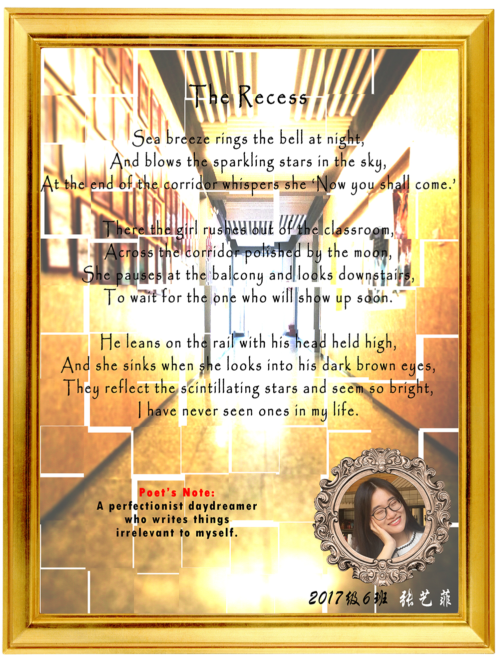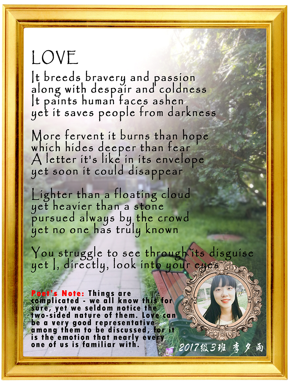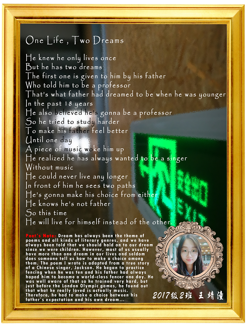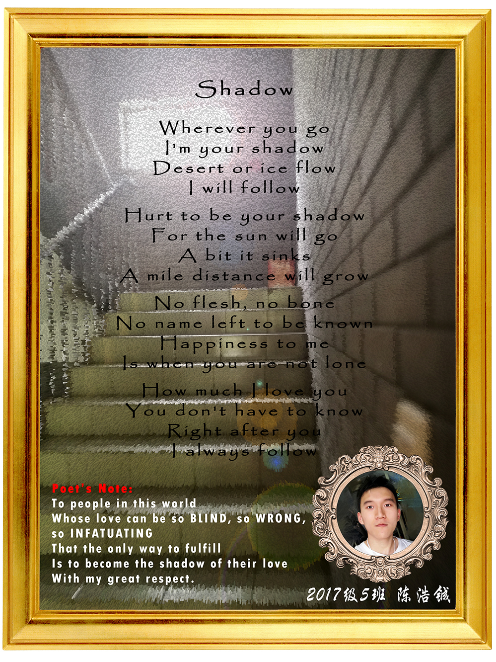 ——2018年春季学期,为丰富教学内容及激发员工学习兴趣,“英语批判性阅读(精读)2:文学与人生”课程教研组依托教材相关内容,组织公司2017级共7个班所有本科员工开展了“英文诗歌创作”活动,同学们积极参与,均提交了优秀作品,经过同学间相互赏读和评议,甄选出最受欢迎的21首英文诗歌作品,特此展示。此次活动中,同学们展现出高涨的热情、非凡的创造力、丰富的情感知识、健康的审美情趣、深刻的生活感悟,以及优秀的英文书面表达能力。
