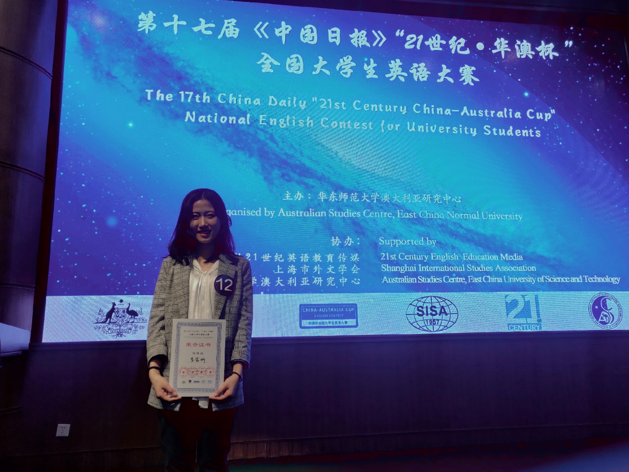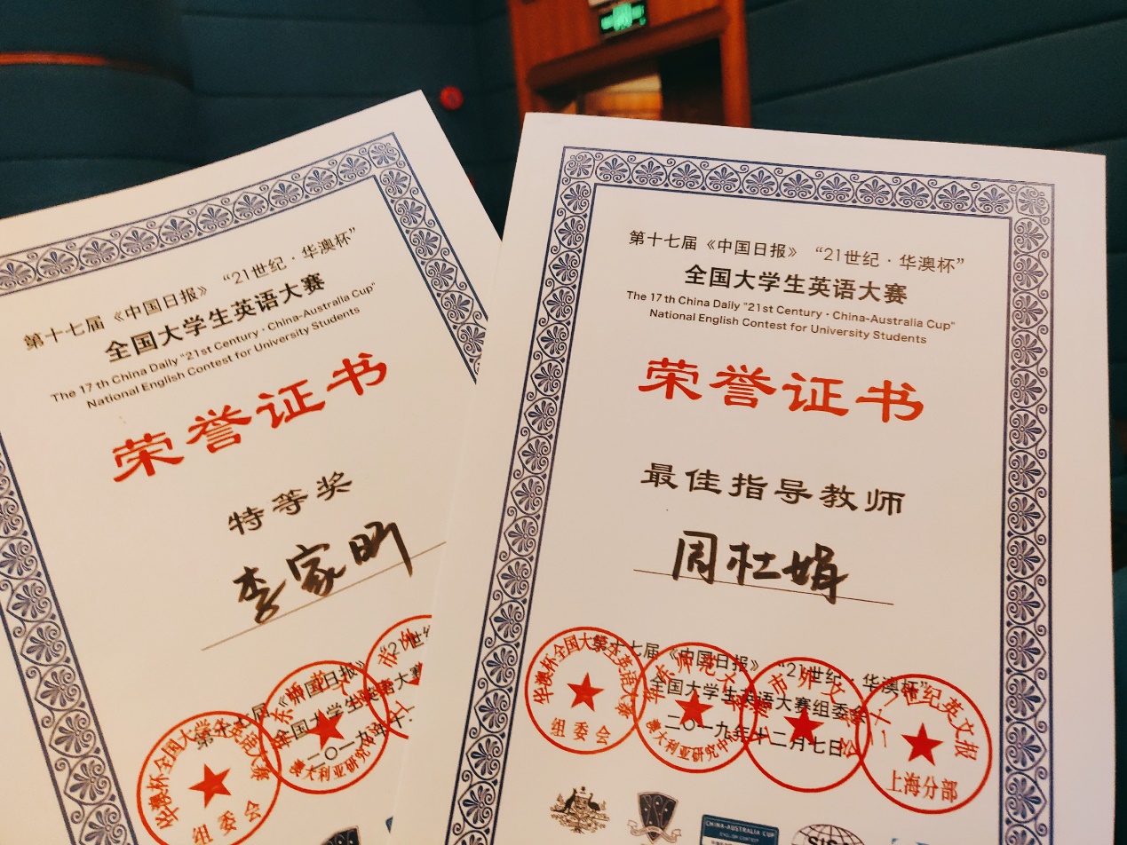 12月7日,由华东师范大学澳大利亚研究中心主办,中国日报21世纪英文报、上海市外文学会、华东理工大学澳大利亚研究中心协办的第十七届《中国日报》“21世纪·华澳杯”全国老员工英语大赛圆满落幕。公司三亿体育2017级本科生李家昕在26所高校选手中脱颖而出,夺得冠军,荣获特等奖。周杜娟老师获最佳指导老师。