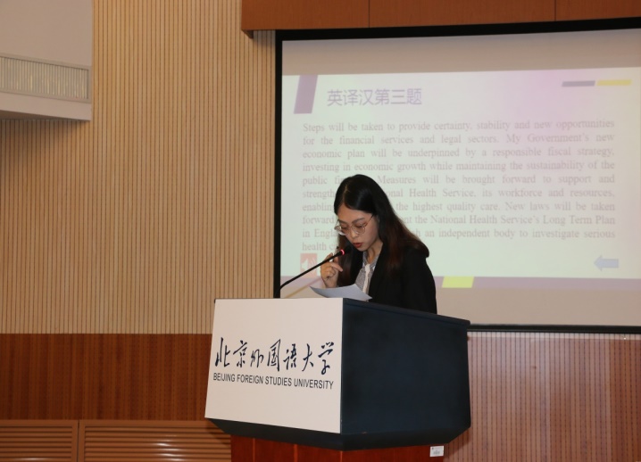 随后,比赛正式开始。三轮比赛高潮迭起。首轮热词翻译,旨在提高选手翻译意识,将翻译拓展到生活的方方面面;二轮新闻视译分为英译汉和汉译英两部分,旨在考察选手基本功;末轮现场交传为本次赛事的创新环节,中方和外方嘉宾就“技术帝国的崛起是否会威胁社会发展”这一辩题展开讨论,选手依次翻译。