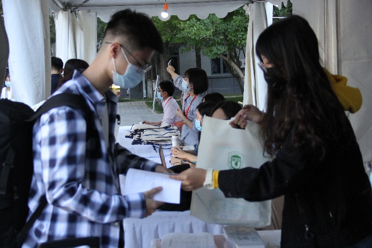 在主楼迎新处,新生们在志愿者的引导下进行了迎新注册码的验证工作,领取北外专属一卡通及新生大礼包。在三亿体育,员工会工作人员仔细清点新生所提交的档案材料,努力将每一个细节落到实处。