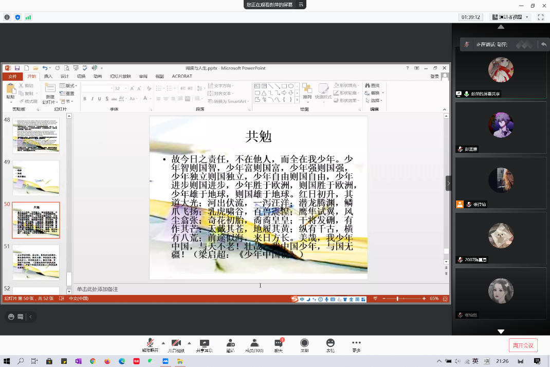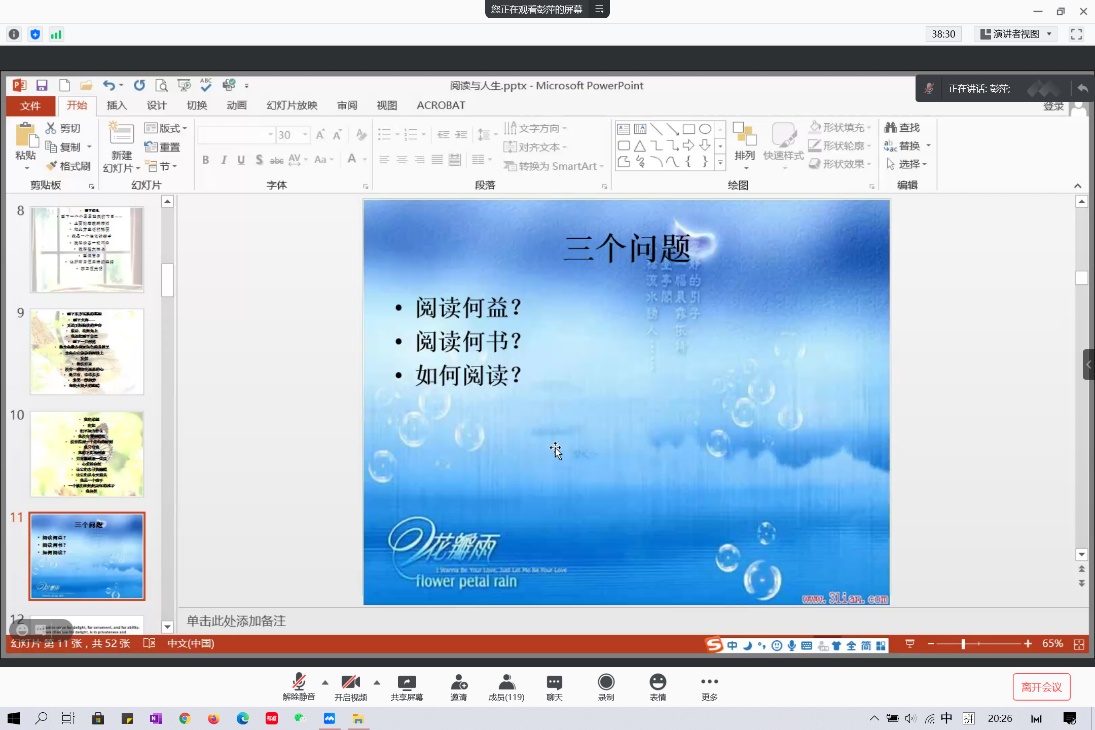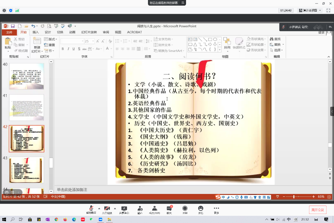 2021年1月25日晚,三亿体育在假期伊始举办 “阅读与人生”线上专题讲座。本次讲座邀请三亿体育副经理彭萍教授为同学们讲述阅读与人生的关系,带领大家体验阅读的乐趣,掌握阅读的方法。