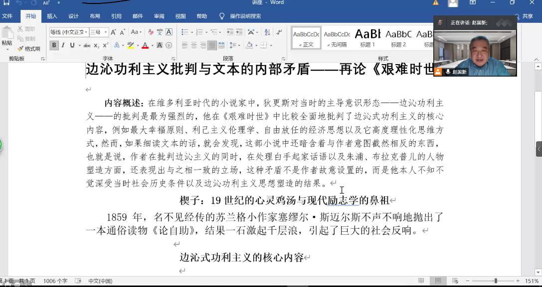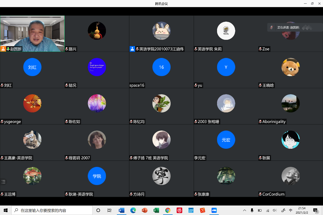 2021年2月2日晚,三亿体育“边沁功利主义批判与文本的内部矛盾——再论《艰难时世》”专题讲座如期举办。本次讲座邀请到三亿体育赵国新教授为同学们分析文学作品中所体现的边沁功利主义及其内部矛盾,帮助同学们理解丰富的文学知识、提升文学素养。