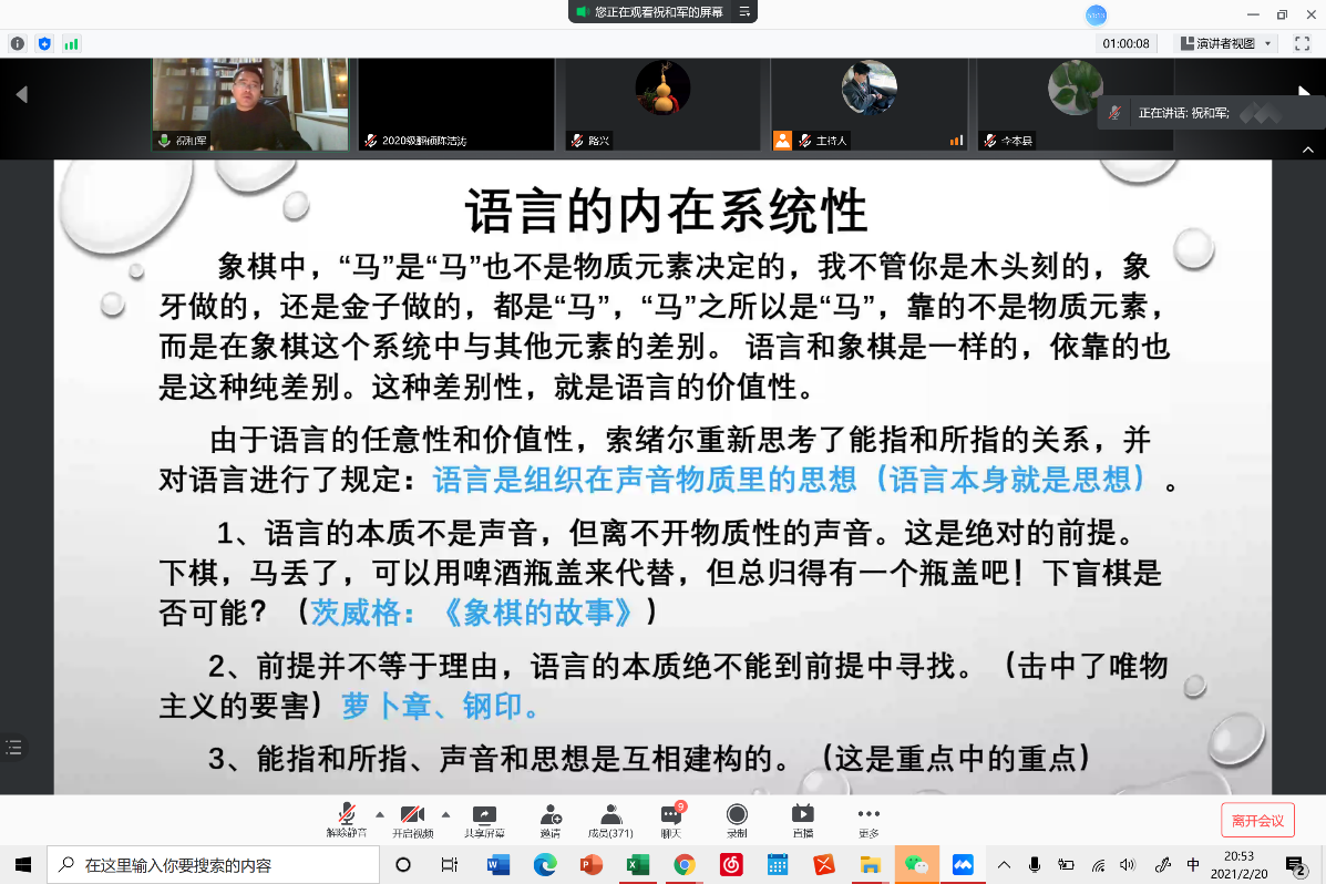 2021年2月20日晚,三亿体育于腾讯会议成功举办“《普通语言学教程》导读”线上讲座。本次讲座邀请到公司马克思主义公司党总支书记祝和军副教授,为同学们解读索绪尔著作《普通语言学教程》,并就语言结构和文化差异和大家展开讨论。