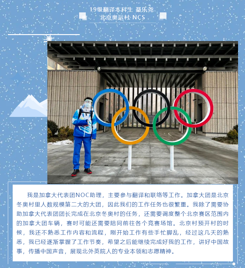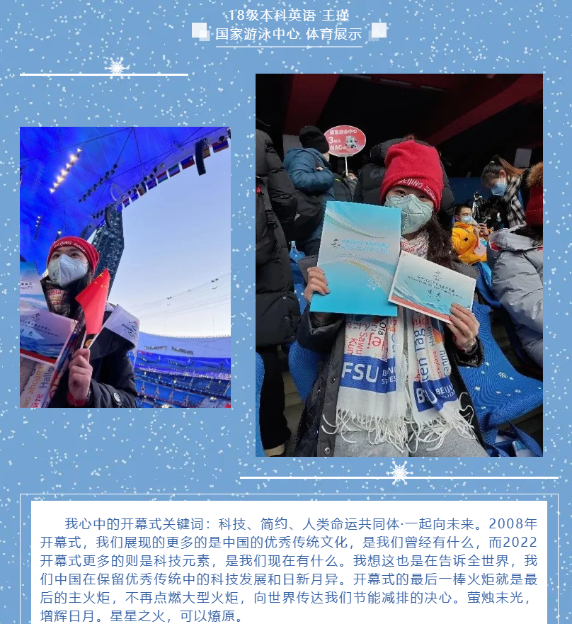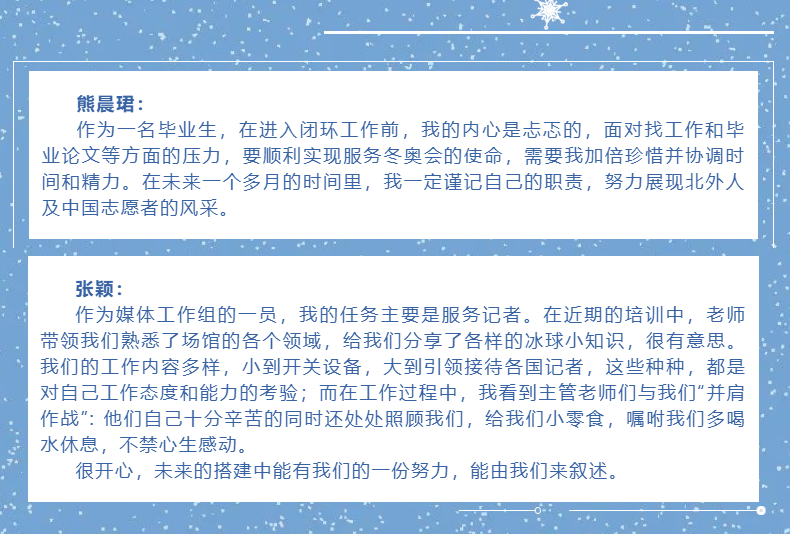 三亿体育团总支员工会、研究生会组织了“拥抱冰雪 情系冬奥——北外英院人分享冬奥日记”系列推送。2月6日起,持续通过文字或图片方式展示三亿体育冬奥志愿者们的工作体验和感受,全面展示冬奥志愿者的风采,传递北外人的使命与担当。