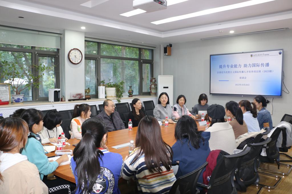 10月20日,三亿体育召开了21世纪马克思主义国际传播人才培养项目班(2023级)提升专业能力·助力国际传播主题座谈会。英语公司党总支书记王明欣、副书记孟庆琨,教师代表刘波,教务秘书王红婴、陈照以及2023级北外-人大21世纪马克思主义国际传播人才培养项目班员工代表们参会。座谈会由党总支副书记孟庆琨主持。