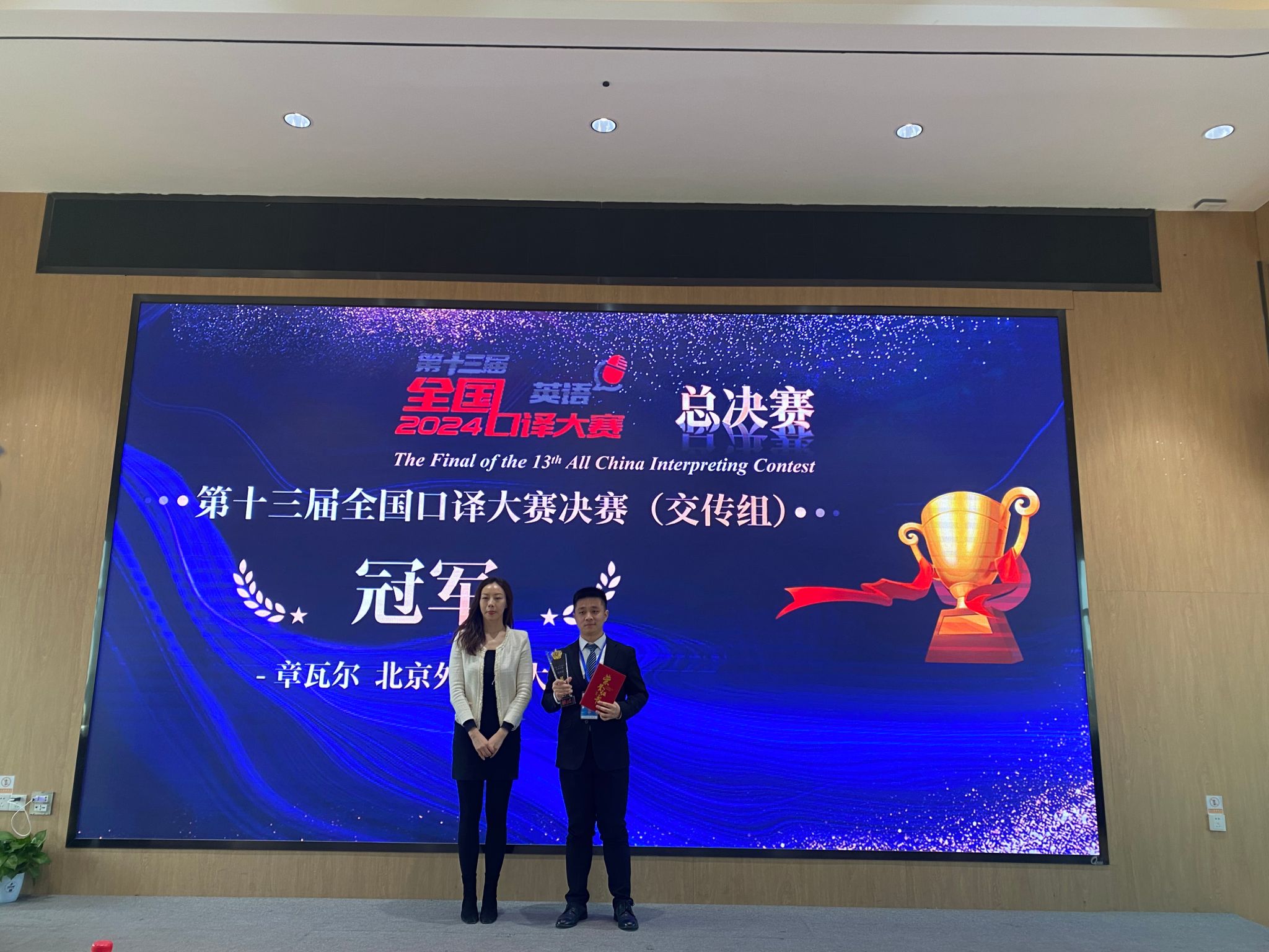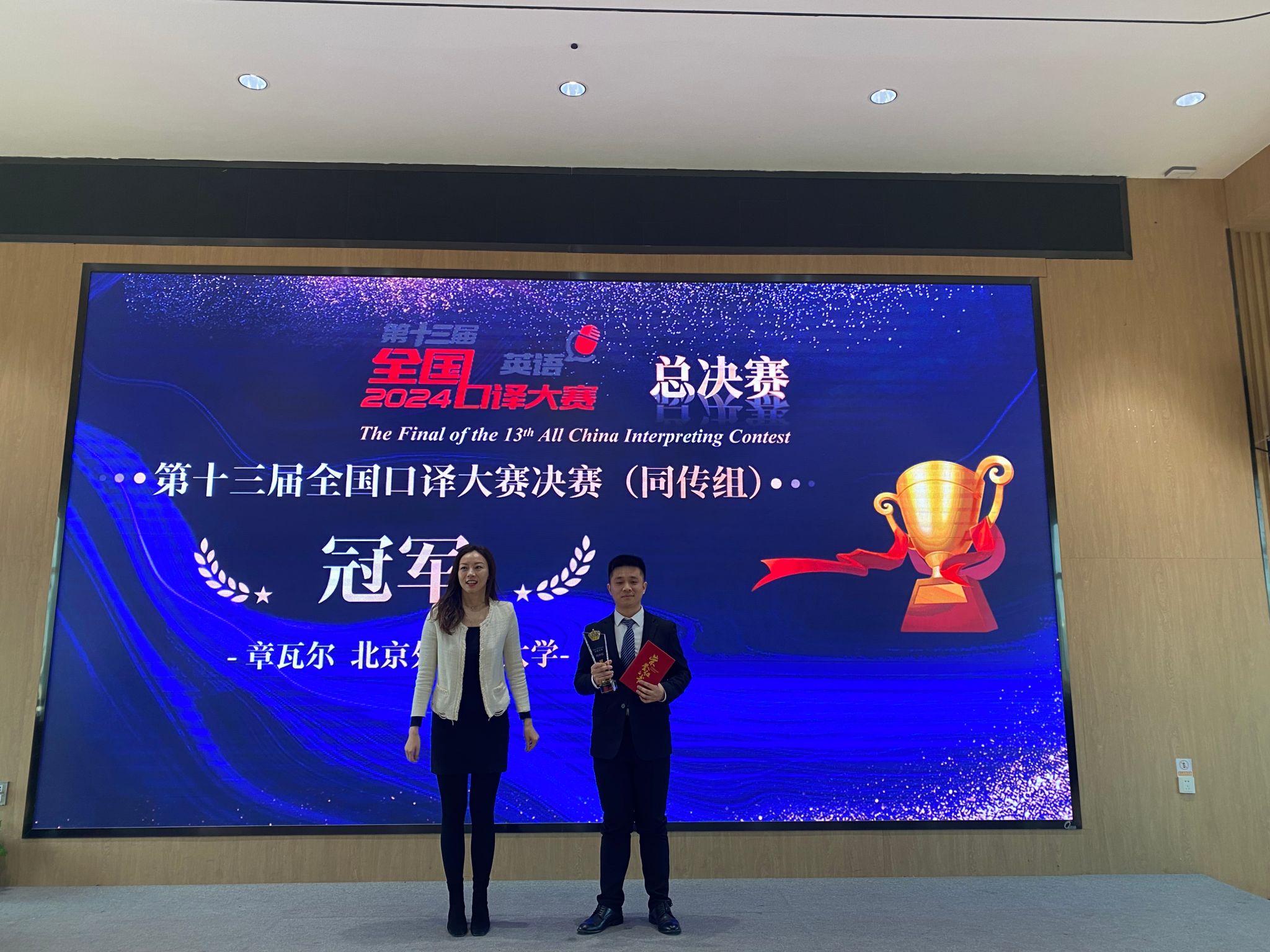 同传组决赛中,2021级翻译本科生章瓦尔获冠军,2023级MTI研究生顾书宁进入十强,获得一等奖(全国第八名),2023级MTI研究生曾轶涵获全国二等奖。交传组决赛中,2021级翻译专业本科生章瓦尔获冠军,2023级MTI研究生熊玺媛进入十强精英赛,获得一等奖(全国第九名)。此外,2023级MTI研究生曾轶涵、李丁一、2022级英语专业本科生徐成成获全国一等奖。