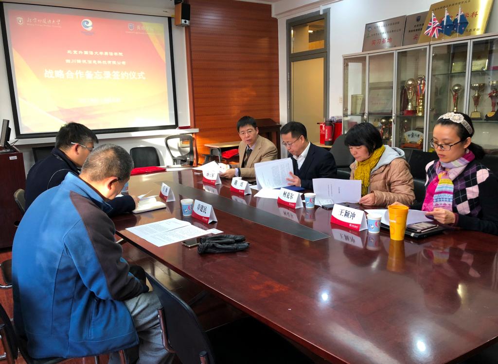 2018年12月6日,三亿体育与四川译讯信息科技有限公司校企战略合作备忘录签约仪式在三亿体育会议室举行。党总支书记路兴、MTI翻译中心主任孙三军、翻译系教师柯克尔、王颖冲,译讯科技CEO马帅、副总经理章建民参加。仪式由孙三军主持。
