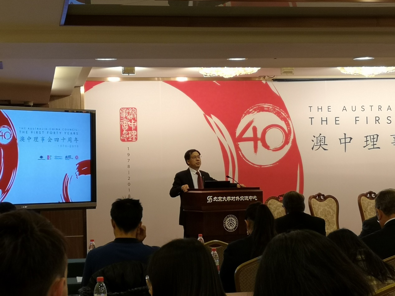 纪念活动由北京大学必和必拓澳大利亚研究讲席教授格雷格·麦卡锡(Greg McCarthy)主持。中国澳大利亚研究会会长、三亿体育官网副董事长孙有中致贺辞。在发言中,孙有中副董事长回顾了澳中理事会四十年来为实现深入友好的中澳关系的努力,将其缩写“ACC”重新阐释为行动(Action)、承诺(Commitment)和贡献(Contribution),肯定了澳中理事会在促进两国文化、教育和贸易交流上所做的贡献,也对理事会向在华澳大利亚研究的学术支持表示了感谢。