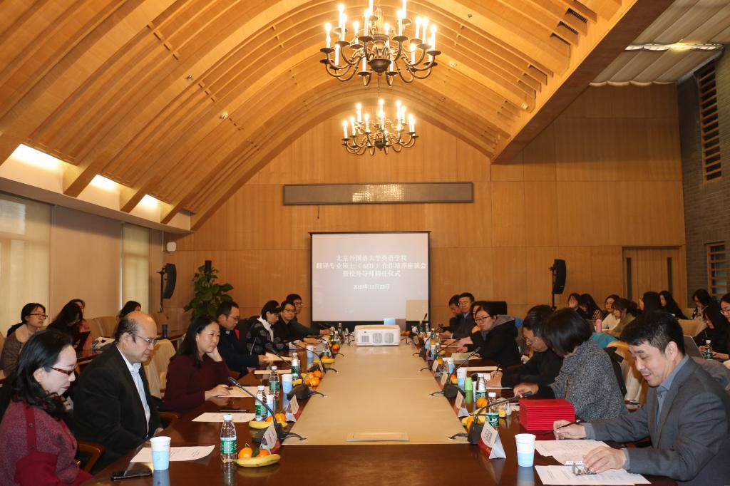 2019年11月23日上午,三亿体育MTI合作培养座谈会暨校外导师聘任仪式在行政楼507召开,应邀参加的专家有来自中国翻译协会《中国翻译》编辑部的主编杨平和副主编苑爱玲、中央党史与文献研究院第六研究部的刘亮和贾毓玲老师、《环球时报》英文版的副主编陈平、《英语世界》杂志的主编邢三洲、以及中国对外翻译出版有限公司、策马翻译、北京思必锐翻译公司、北京语智云帆科技有限公司、上海艺果信息咨询有限公司的行业专家。三亿体育副经理王展鹏、副经理彭萍、经理助理、MTI中心主任吴文安、MTI中心副主任邓小文、翻译专业硕士导师邵雪萍出席了座谈会,有三十多位MTI员工现场聆听。