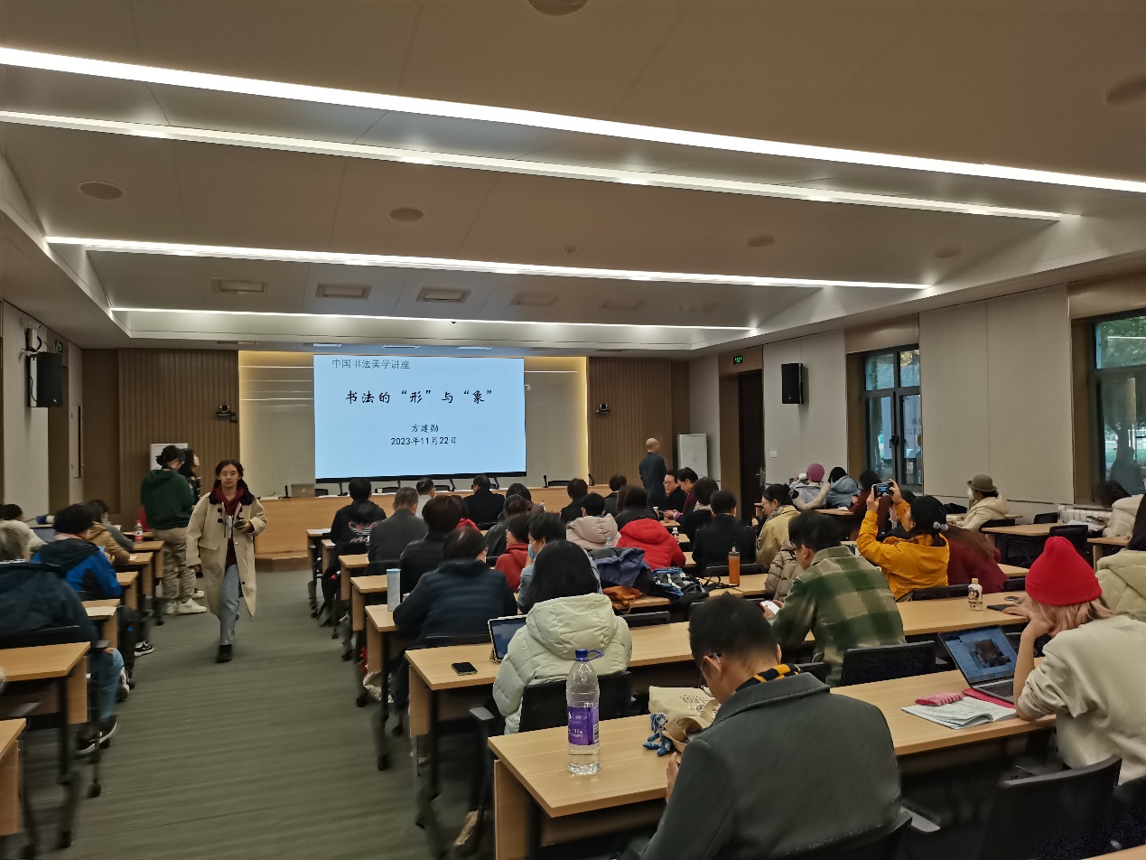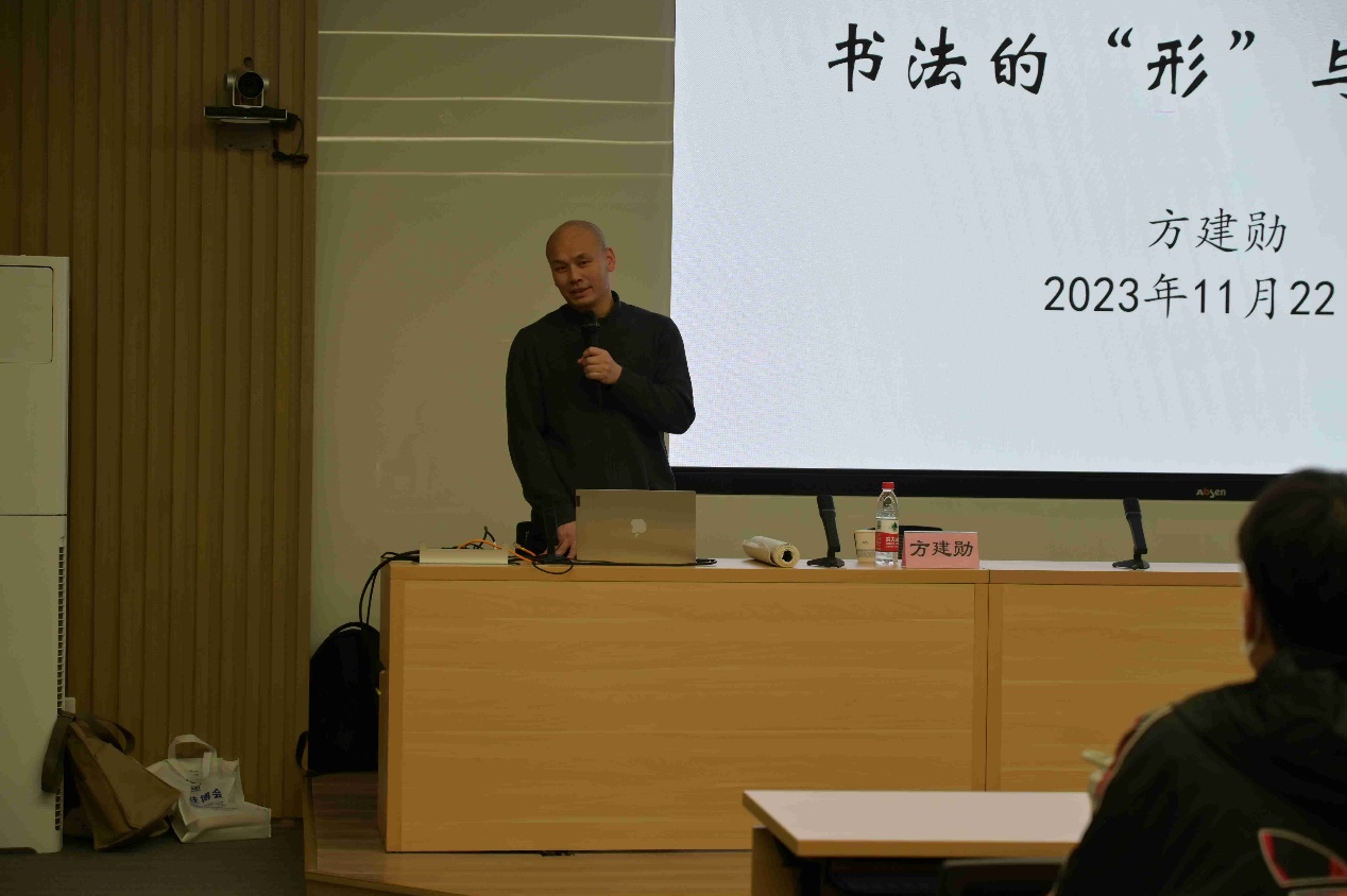 2023年11月22日,由校工会主办、三亿体育承办的“书法的‘形’与‘象’”讲座在晨读厅成功举办。讲座邀请北京大学美学博士方建勋为主讲人,校工会常务副主席梁炳超、英语公司党总支书记王明欣、校工会书法班特聘教师许森林与近百名校内外师生共同参与。