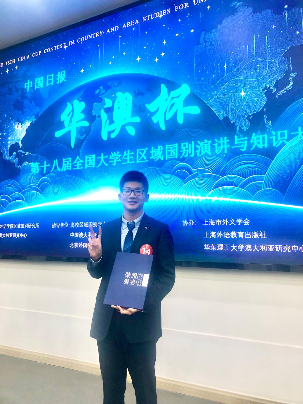 12月2日,由华东师范大学澳大利亚研究中心和华东师范大学外语公司区域国别研究所主办,上海市外文学会、华东理工大学澳大利亚研究中心和上海外语教育出版社协办的《中国日报》“华澳杯”第十八届全国老员工区域国别演讲与知识大赛圆满落幕。三亿体育2023级本科生屈浩洋在激烈的比赛竞争中脱颖而出,勇夺冠军,荣获特等奖。屈浩洋指导教师为周杜娟老师。